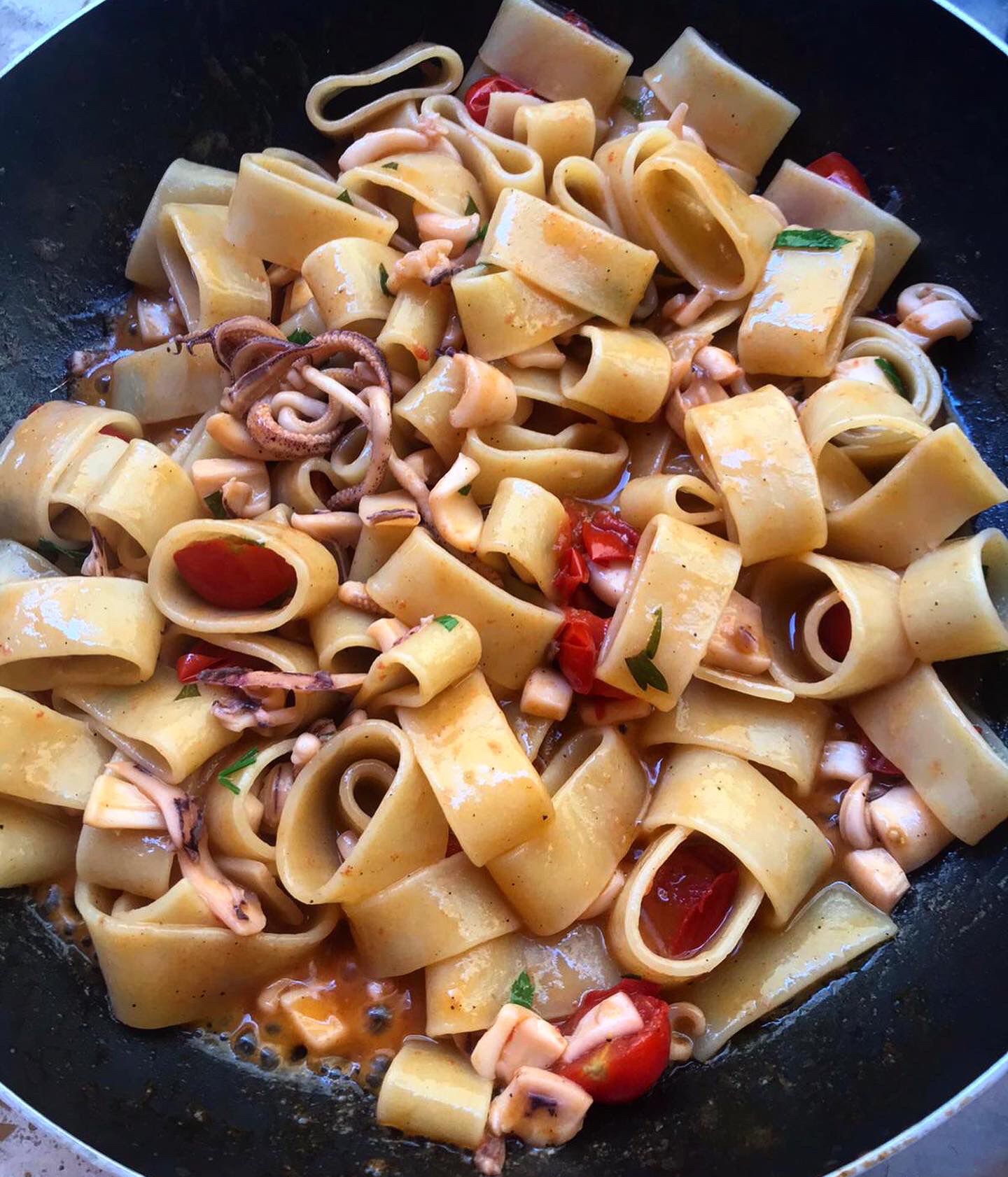 Mettete a bollire in un tegame abbondante acqua da salare a bollore per poi cuocere la pasta. Nel frattempo scaldate l'olio in una padella con lo spicchio d'aglio.Aggiungete i calamari tagliati ad anelli e sfumate con il vino bianco.Appena sarà evaporato aggiungete il ciliegino,il concentrato e fate cuocere con il coperchio.A fine cottura spolverizzate con il prezzemolo tritato,nel frattempo potrete cuocere la pasta fino a metà cottura.Non appena la pasta è cotta ,scolatela e fate proseguire la cottura all'interno della padella con il condimento,aggiungendo quando necessario l'acqua di cottura. Appena pronta impiattate e se volete mettete un pò di granella di pistacchio.