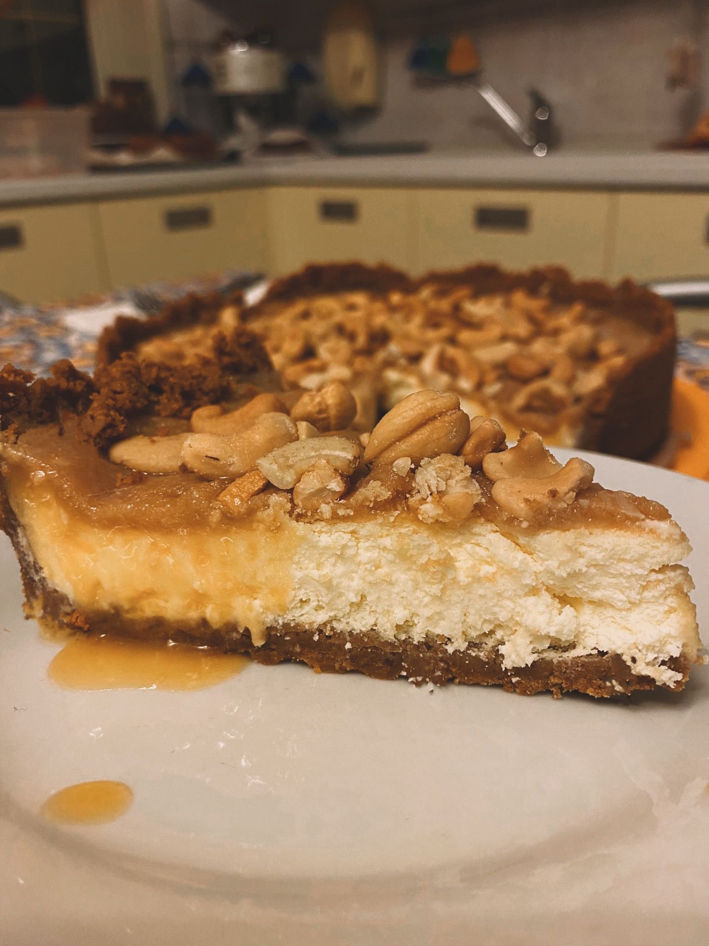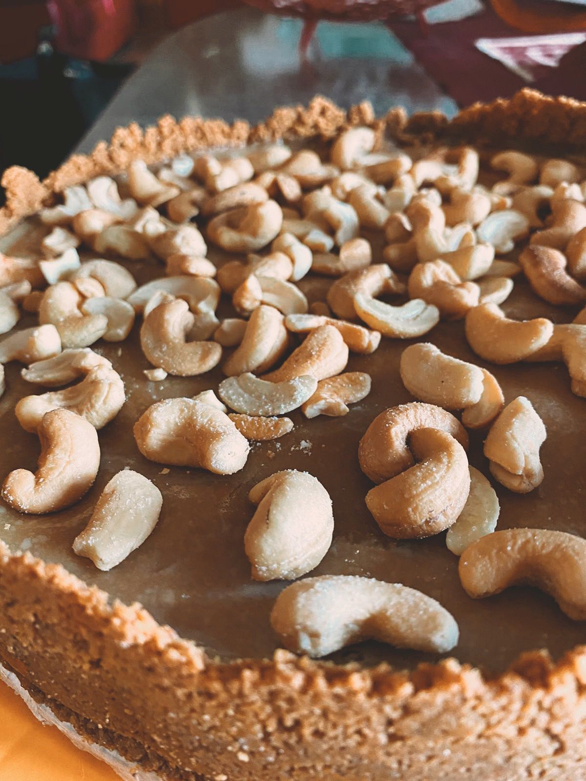 Appena la torta sarà raffreddata versare sopra il caramello salato e cospargere con gli anacardi o con frutta secca a vostra scelta.