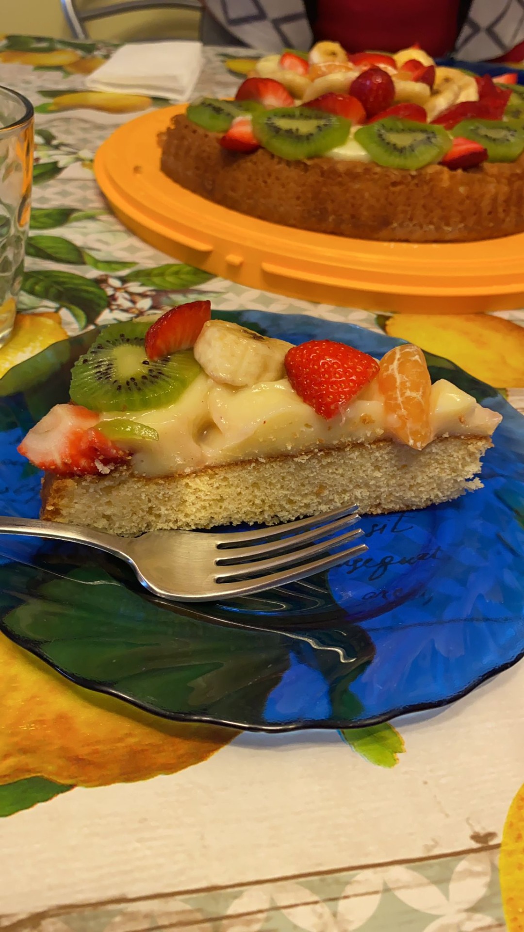 In una ciotola rompiamo le uova e iniziamo a mescolare aggiungendo lo zucchero. Quindi uniamo l'olio di semi, il latte e la farina un po' alla volta. Infine incorporiamo mezza bustina di lievito. Ungiamo e infariniamo lo stampo furbo da 30 o 32 cm e versiamoci l'impasto livellando bene con la spatola. Inforniamo a 180°C con il forno statico, oppure a 170°C con il forno ventilato. Il tempo di cottura è di 20 minuti circa. Una volta pronta, lasciamo raffreddare la base. Quindi aiutandoci con un piatto rovesciamo lo stampo per far uscire la crostata. La parte con lo scalino dovrà risultare in alto. Per una bagna alcolica uniamo mezzo bicchiere di acqua zuccherata con un po'di limoncino. Per una bagna analcolica uniamo mezzo bicchiere d'acqua zuccherata al succo di limone, oppure mezzo bicchiere d'acqua col succo di frutta. Con un cucchiaio inzuppiamo tutta la base. Facciamo scaldare il latte con una scorza di limone. Nel frattempo rompiamo le uova in un pentolino, aggiungiamo lo zucchero e mescoliamo bene con una frusta. Quindi incorporiamo l'amido di mais. Quando il latte è caldo eliminiamo la scorza di limone e lo uniamo alla crema mescolando con la frusta. Portiamo il pentolino sul fuoco e mescoliamo fino a quando la crema si addensa, quindi spegniamo il fuoco. Ci vorranno 5 minuti circa. Versiamo la crema sulla base della crostata e livelliamo con la spatola. Tagliamo a fettine la frutta e decoriamo la torta. Vediamo qualche esempio; possiamo procedere a cerchi concentrici dall'esterno all'interno: un cerchio di fragole, uno di kiwi, uno di banane, infine possiamo riempire il centro con i mandarini.