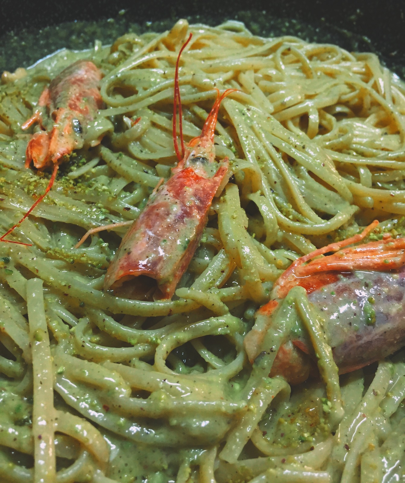 LINGUINE AL PESTO DI PISTACCHIO AGRUMATO E GAMBERONI