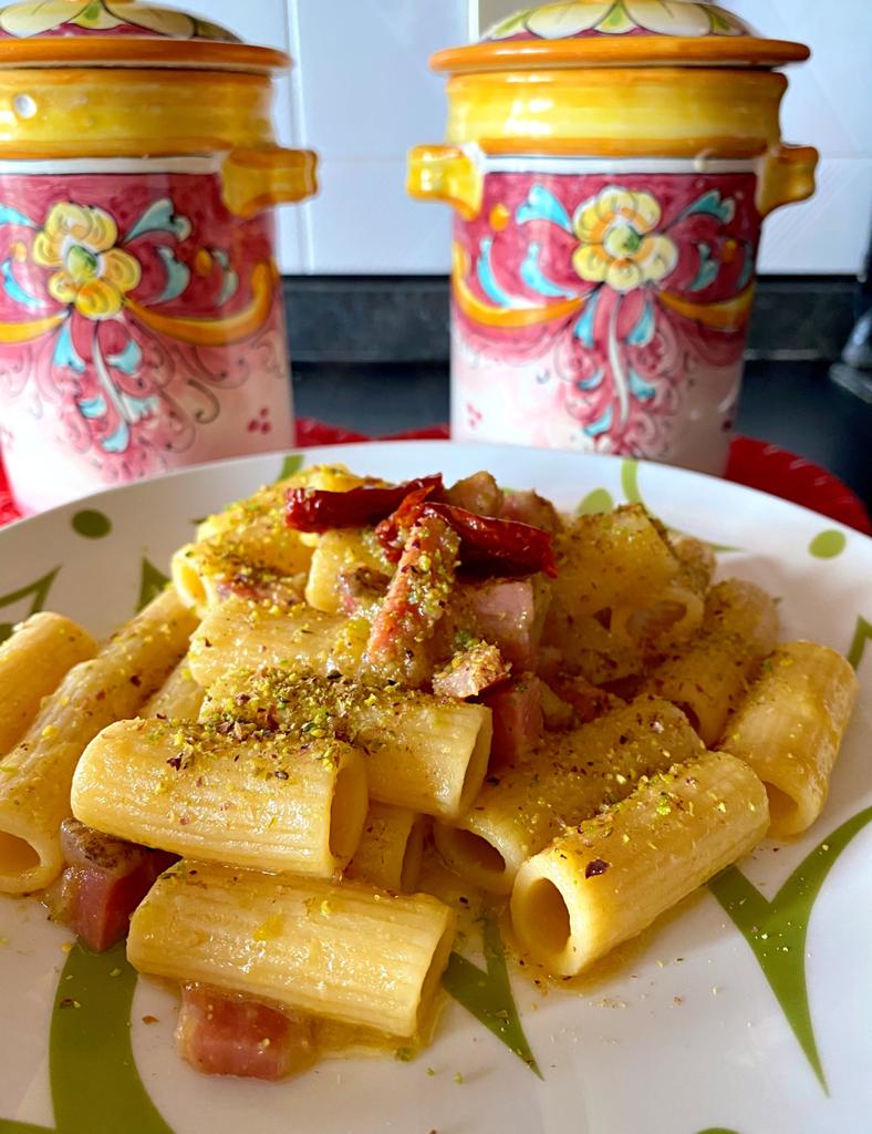 RIGATONI CON SALSA DI DATTERINO GIALLO, SPECK E GRANELLA DI PISTACCHIO